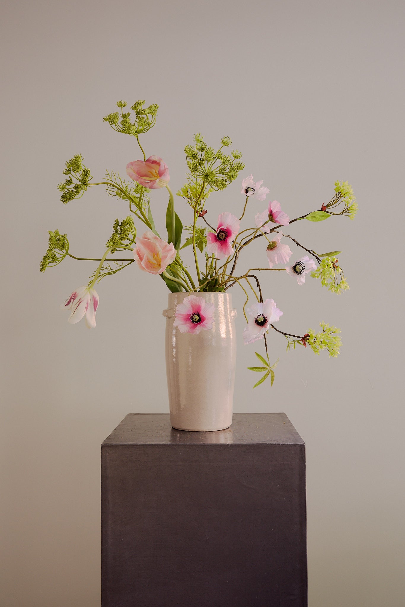 Joyful, open, and full of light. This arrangement centers around poppies and Queen Anne’s lace, layered with tulips, fresh greens, and playful branching. The mix of soft pinks, crisp whites, and bright green tones creates a fresh, lifted feel. It’s the kind of bouquet that instantly brightens a space, like sunlight through trees or a clear view across the park.