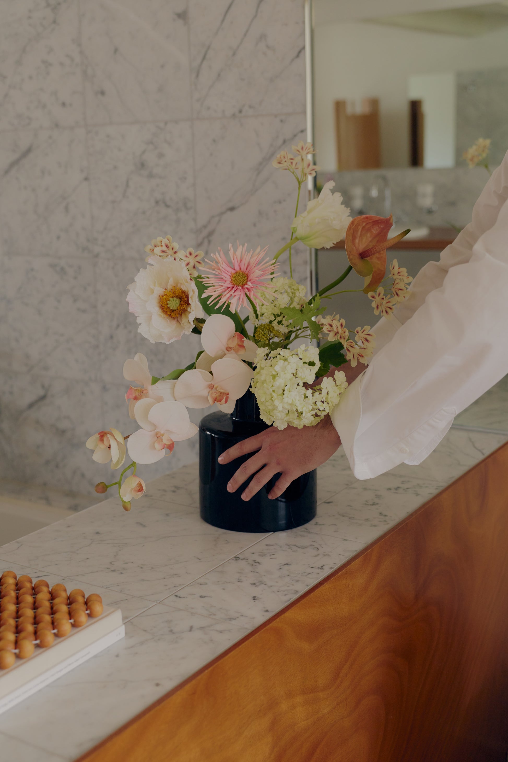 A sculptural mix of pink anthurium, orchid, and soft cream blooms with subtle green accents. The composition feels expressive and slightly unexpected, with varied textures throughout. Ideal for a statement shelf, console, or bedside.