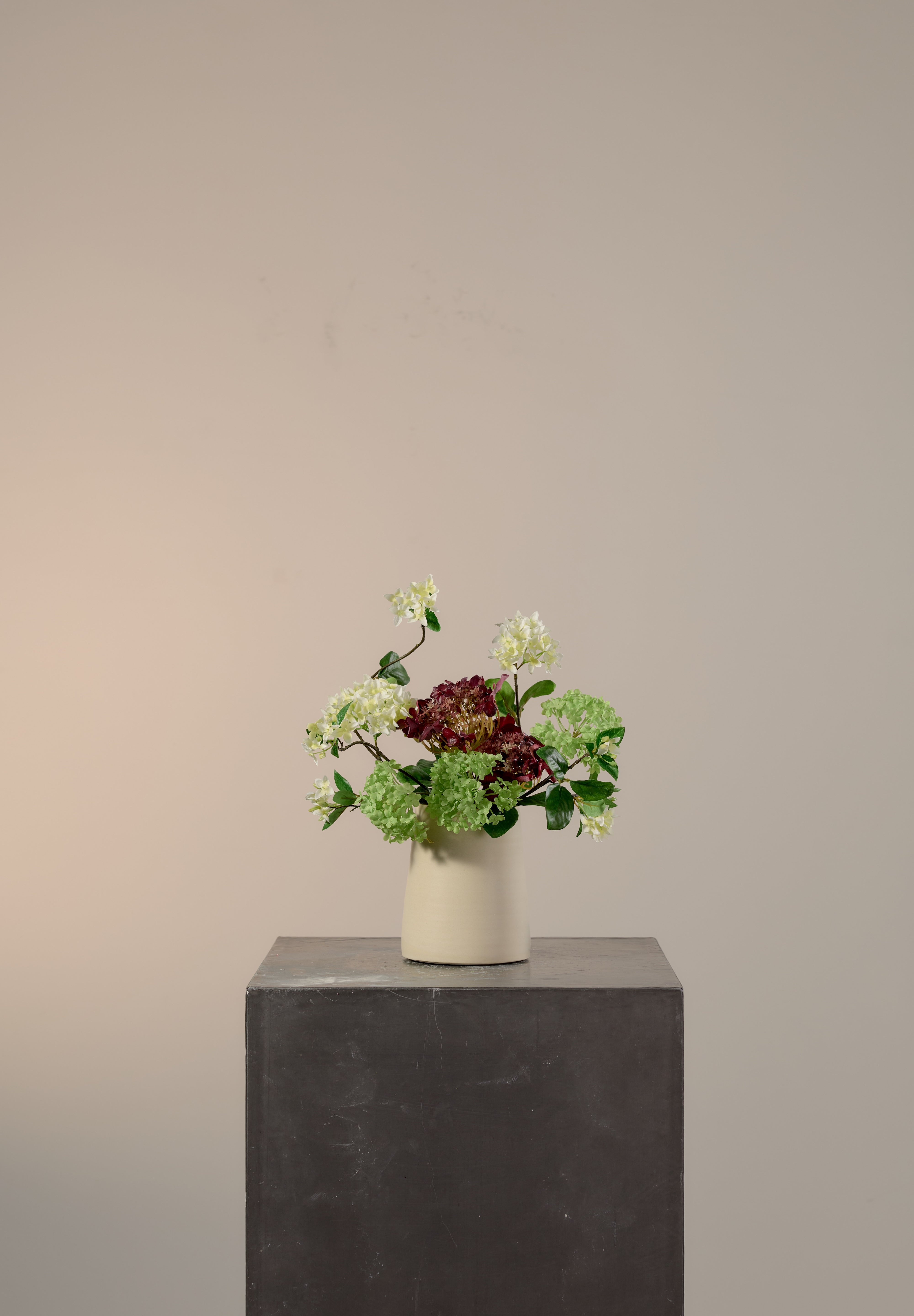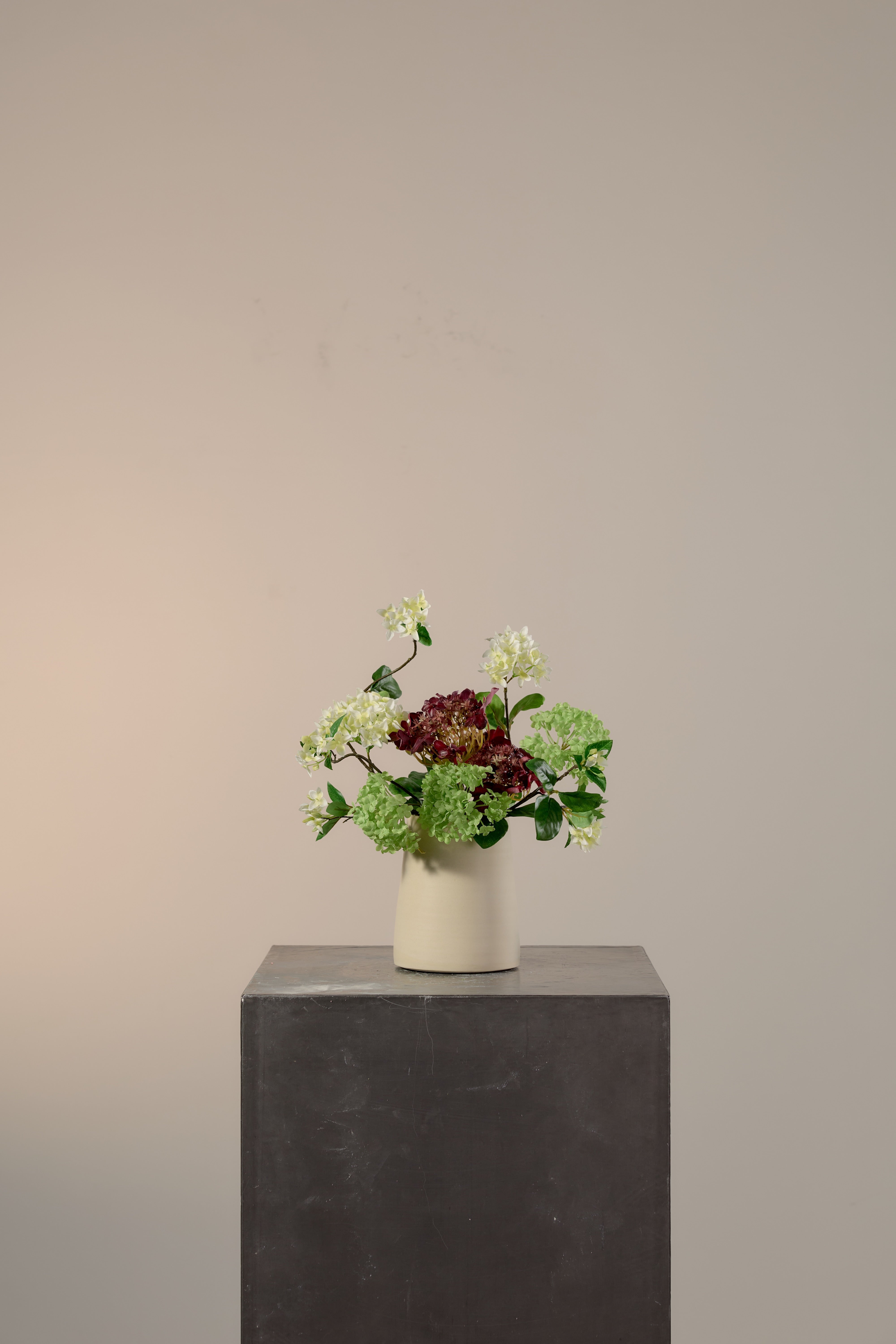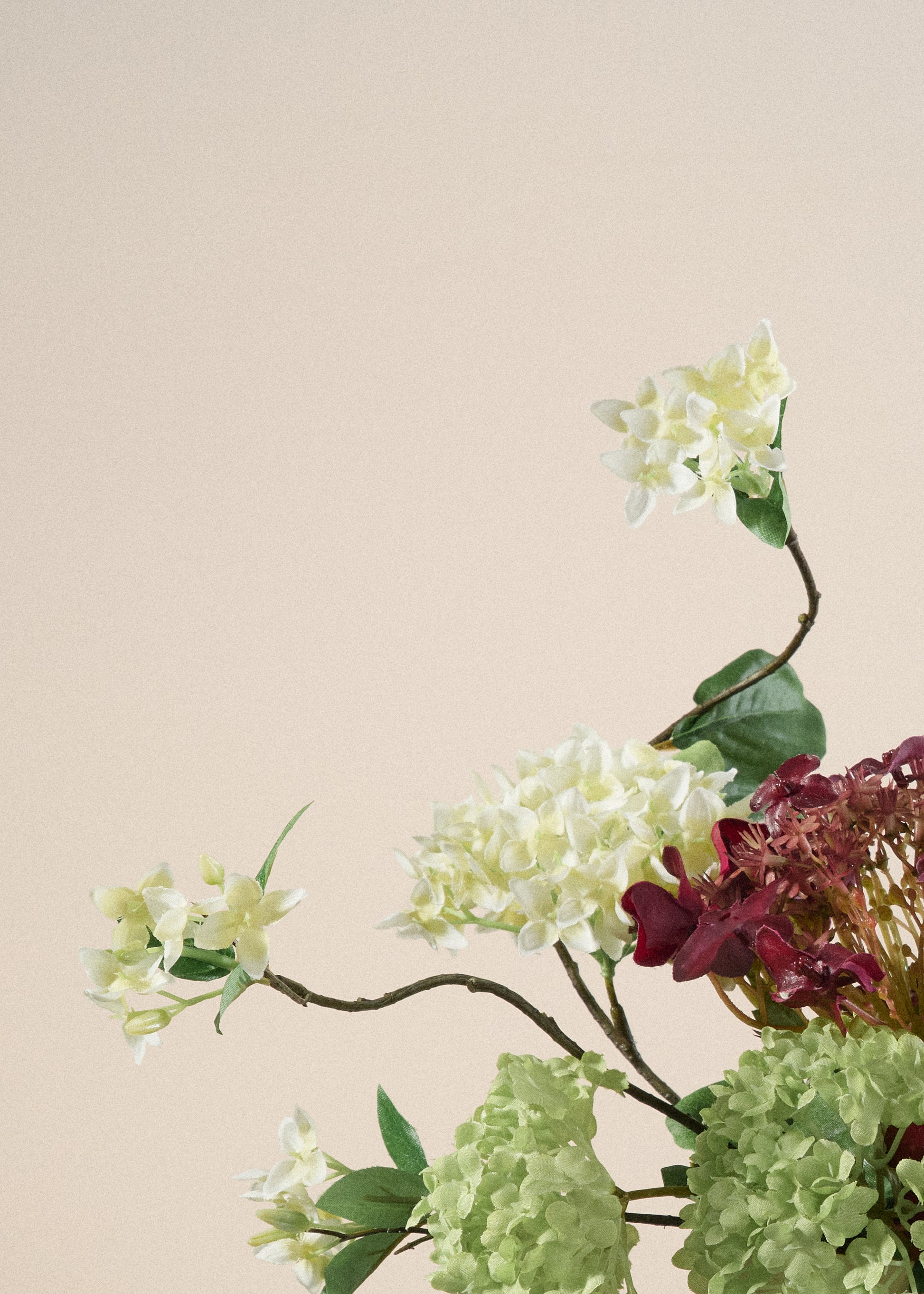 A moody yet fresh composition of burgundy hydrangea, green snowball, and pale lilac. The deeper tones are balanced by soft greens, creating a rich but approachable palette. Perfect for a sideboard, entry table, or styled shelf.