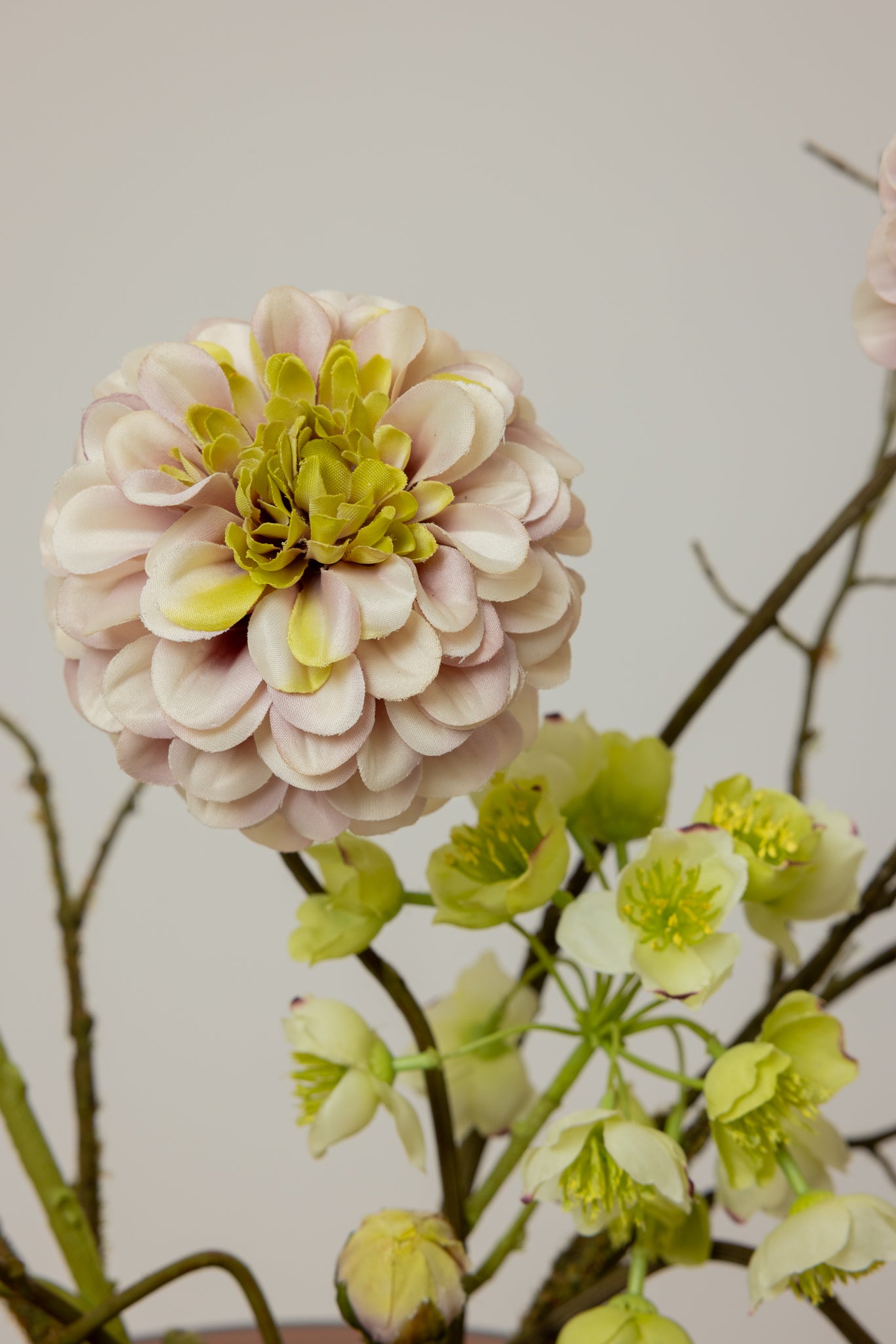 Brown dahlias and peach zinnias create warm neutrals and soft tones that bring a nostalgic, cozy feel to any room. Its delicate branching structure makes it ideal for larger breakfast tables or consoles.