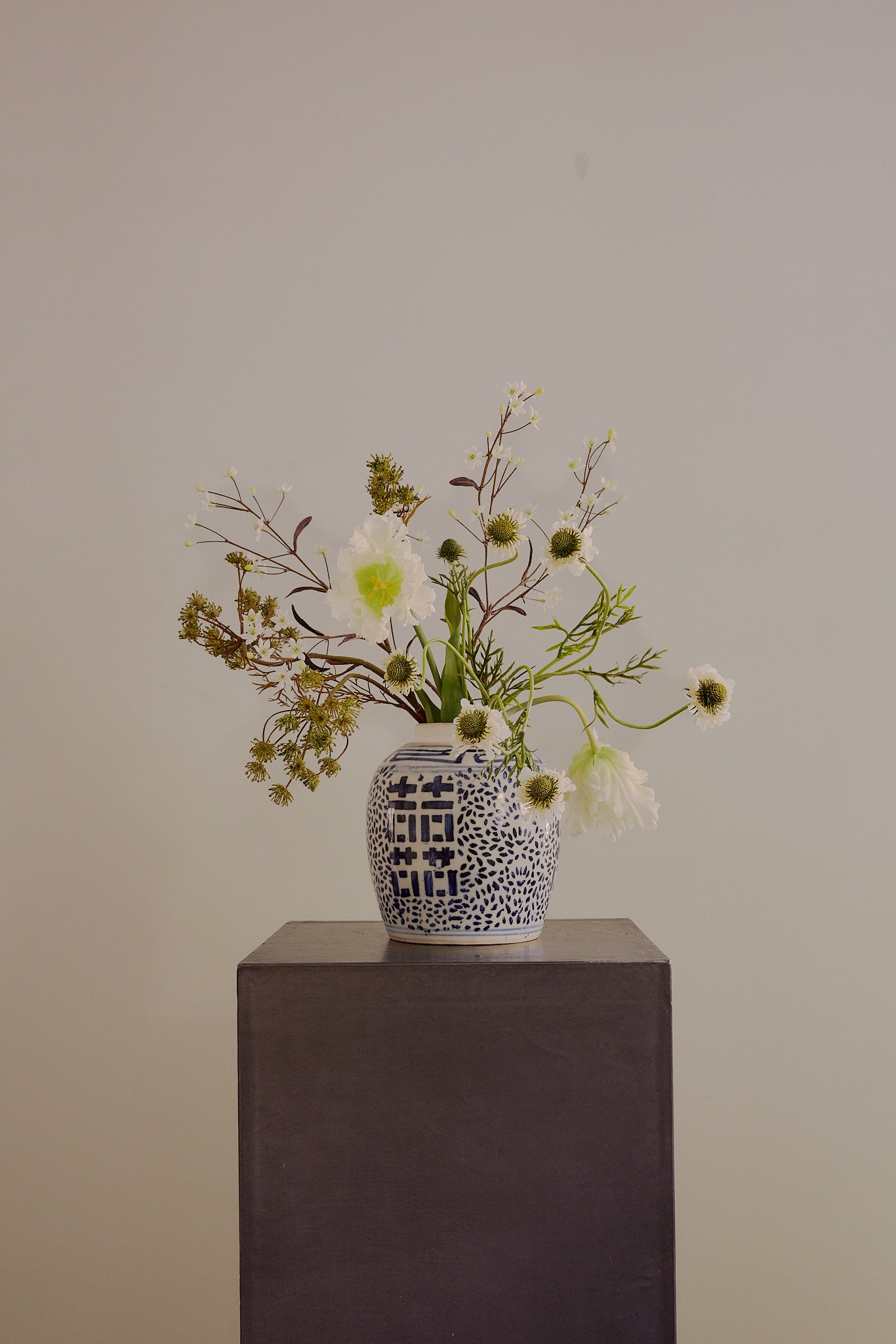 Fresh, unruly, and full of movement. This arrangement leans into natural shapes and soft asymmetry, with crisp whites, loose branching, and varied textures. Sculptural but not stiff, it adds a clean, elevated presence to the room while staying relaxed and unfussy.
