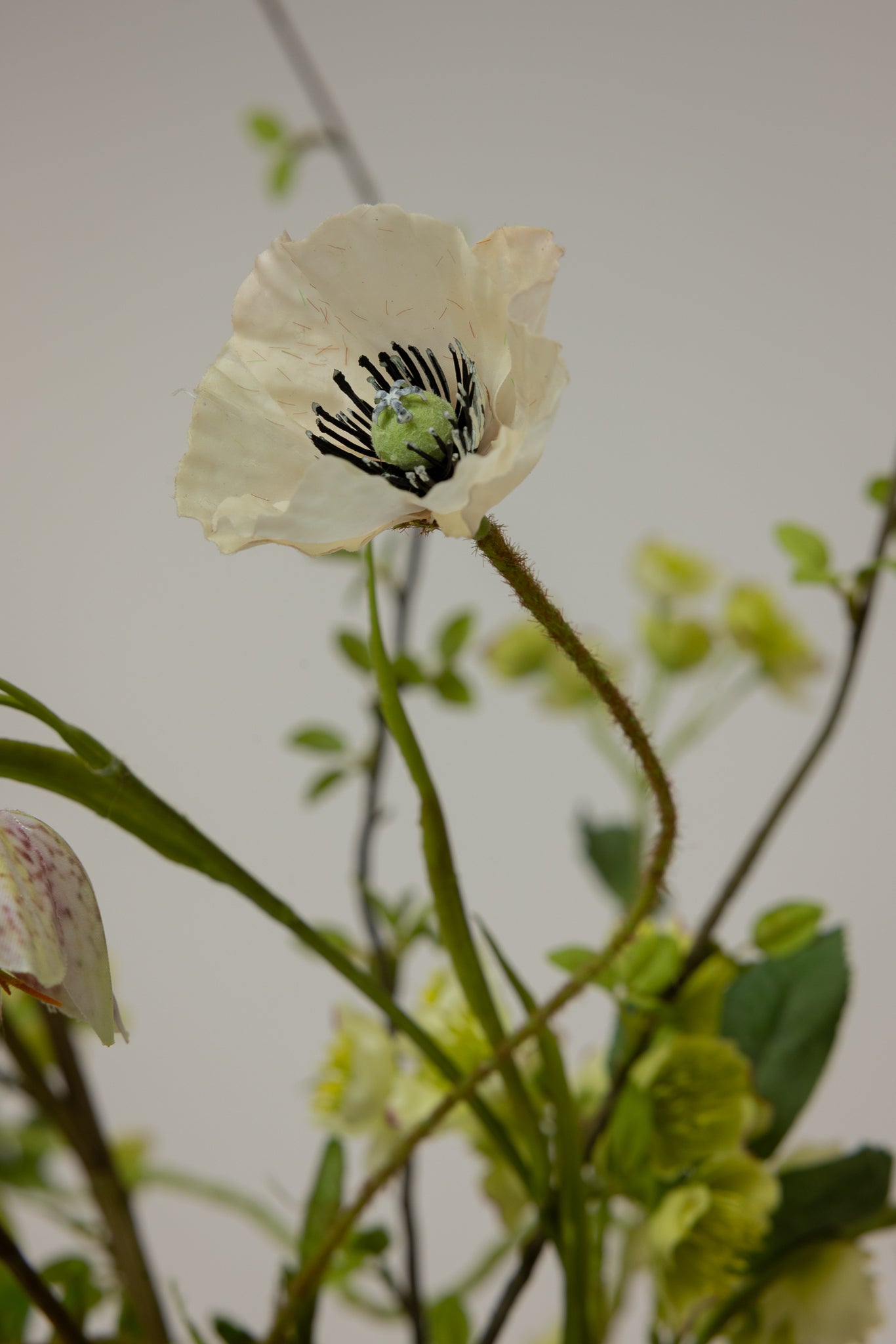 Peach poppies and pink fritillaria blend with airy branching to create a fresh, breezy palette of soft pastels. A beautiful statement piece for a dining table or bright sitting room.