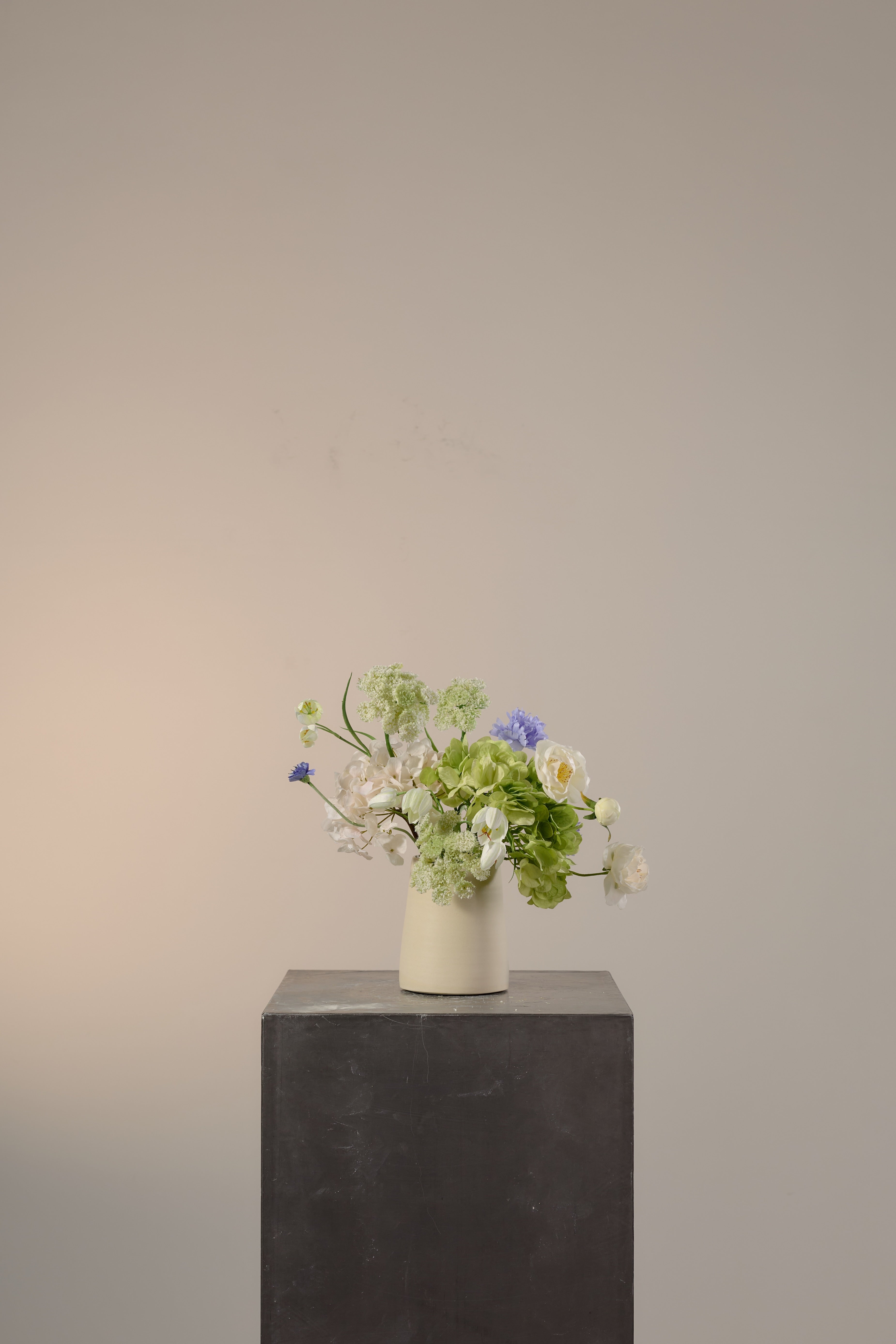 A soft, layered arrangement featuring cream peony, green and cream hydrangea, and delicate Queen Anne’s lace. Light lavender accents add subtle contrast, while the rounded shape keeps it grounded. Ideal for a coffee table, console, or kitchen island.